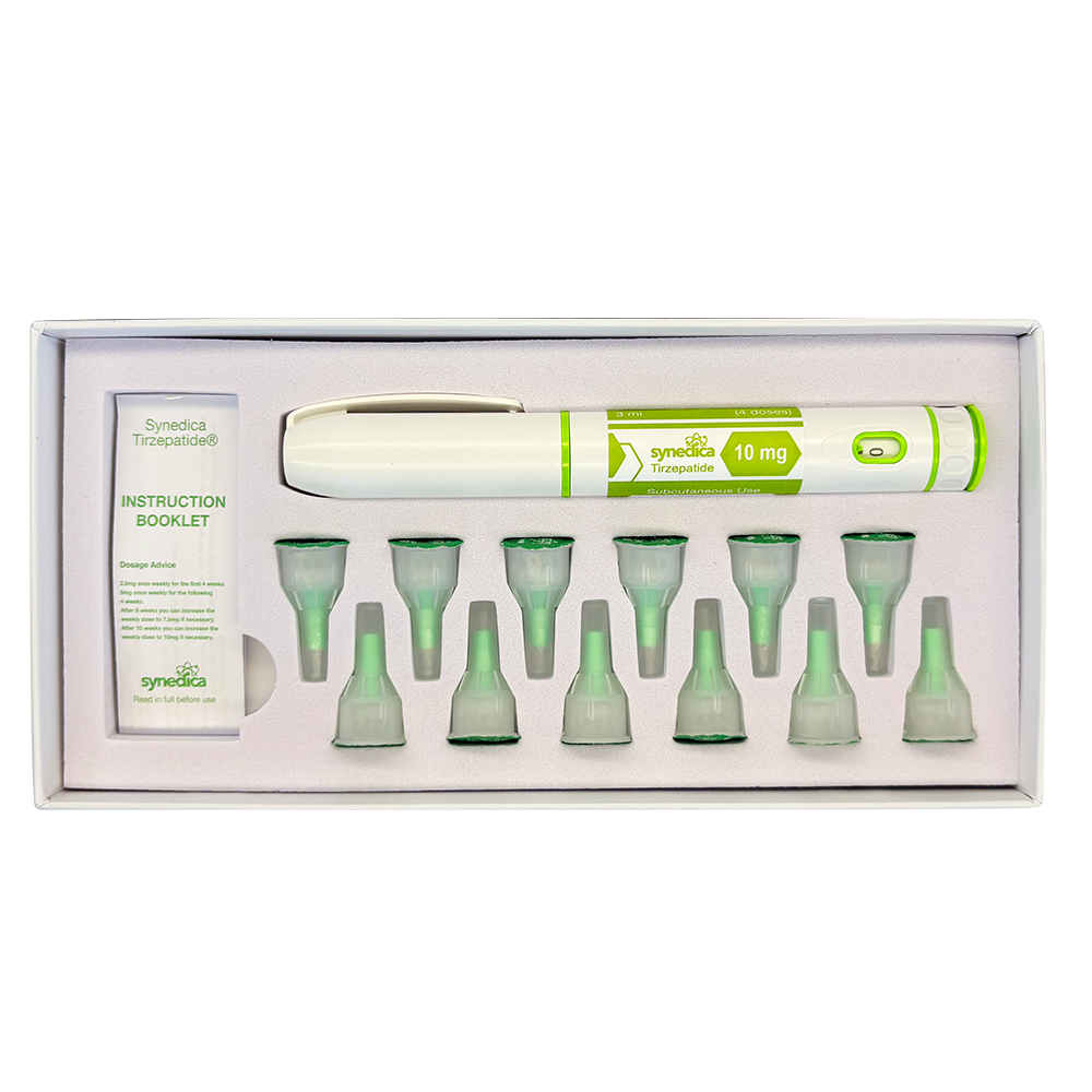 The Synedica Tirzepatide® 40mg Injection Pen Kit contains 1 pen, 12 disposable needles and an instruction booklet.