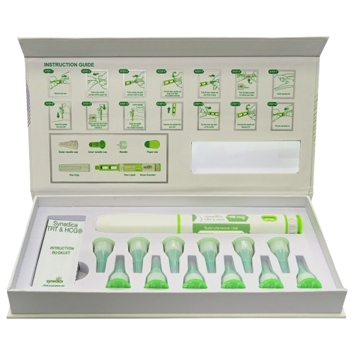 Synedica TRT + HCG Daily Injection Pen Kit® provides a 14 day supply containing 1 injection pen, 14 needles and an instruction booklet.